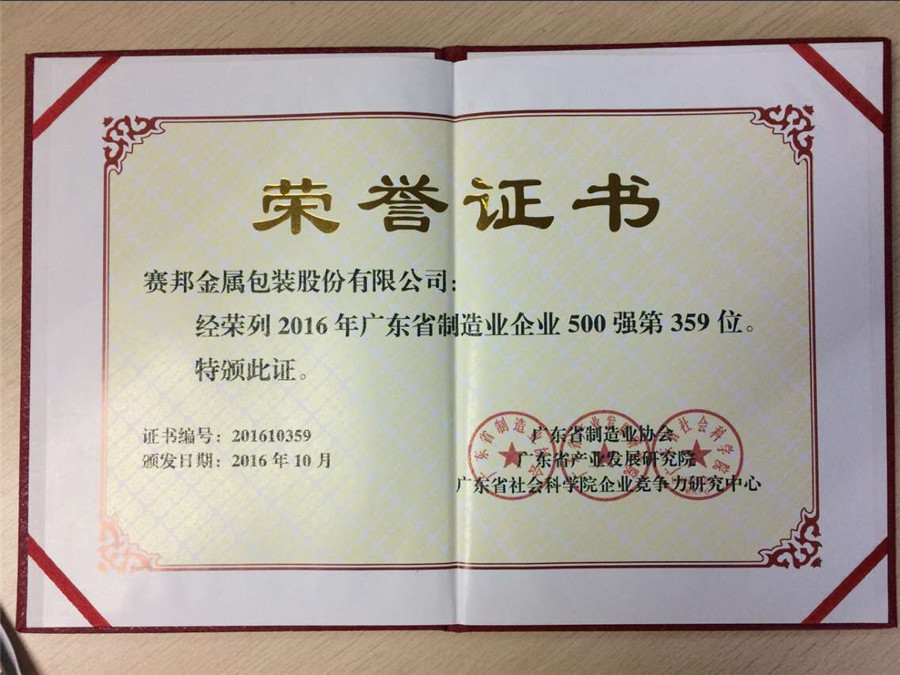 為推動落實“中國智造2025”的國家戰(zhàn)略方針“2016年廣東省制造業(yè)企業(yè)500強”排序工作由廣東省制造業(yè)協(xié)會與廣東省社會科學院企業(yè)研究所聯(lián)合在全省范圍內(nèi)開展,經(jīng)過企業(yè)申報、公開數(shù)據(jù)采集和深入調(diào)查、核實等多渠道進行了信息采集,并按照入圍條件和參照國際上通行的評價準則,經(jīng)專家委員會嚴格審定。賽邦金屬包裝股份有限公司是廣東金屬包裝行業(yè)龍頭企業(yè),近幾年在技術工藝提升,產(chǎn)品結構升級等方面取得重大突破,企業(yè)獲得迅速發(fā)展。